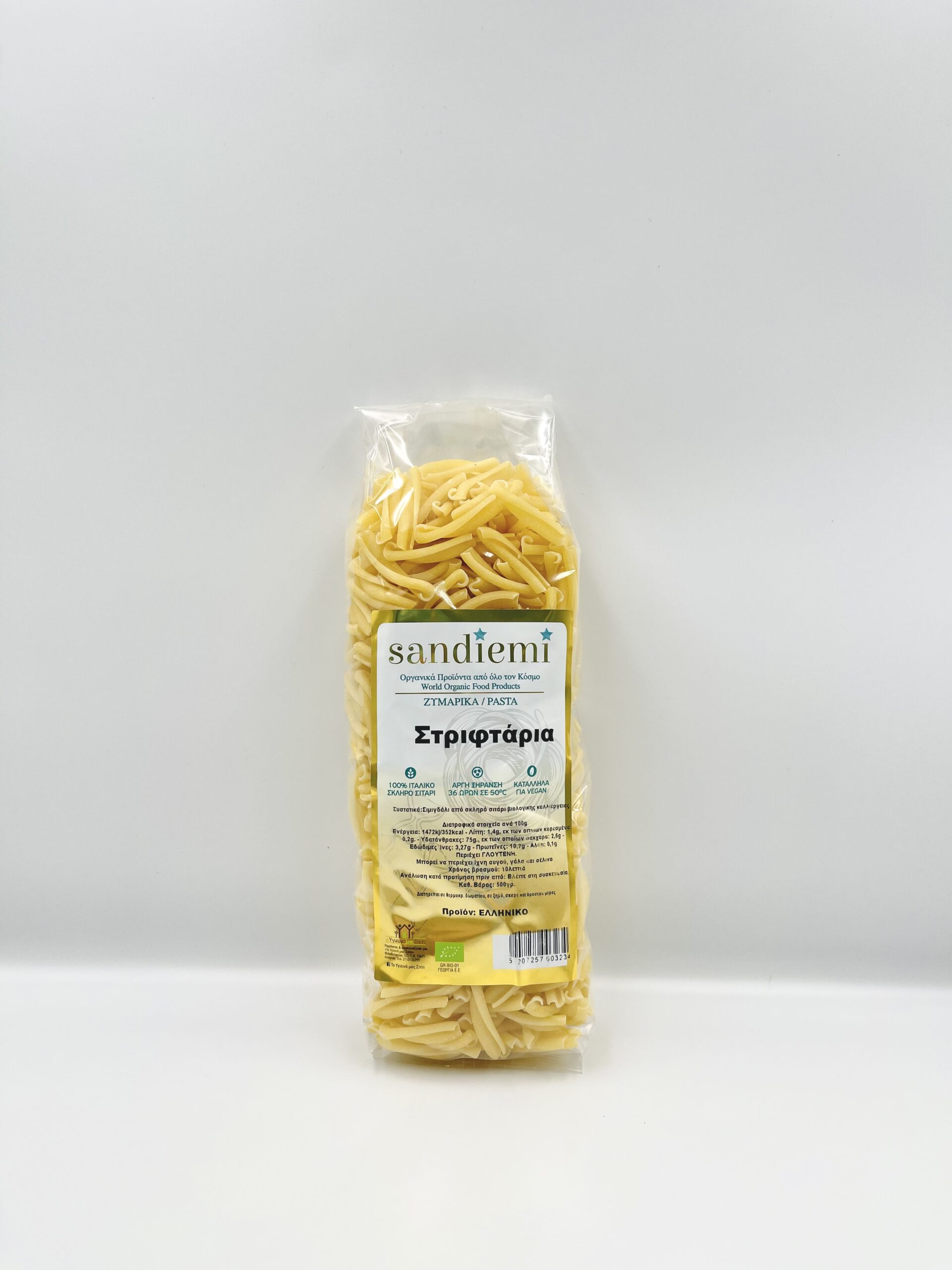 Συστατικά: Σιμιγδάλι από σκληρό σιτάρι, βιολογικής καλλιέργειας Διατροφικά στοιχεία ανά 100γρ. Ενέργεια: 1472/352kcal – Πρωτεΐνες: 10,2γρ. – Φ. Ίνες: 3,27γρ.- Υδατάνθρακες: 75γρ. Εκ των οποίων σάκχαρα:2,6γρ. – Λίπη: 1,4γρ. Εκ των οποίων κορεσμένα: 0,2γρ. – Αλάτι: 0,1γρ.