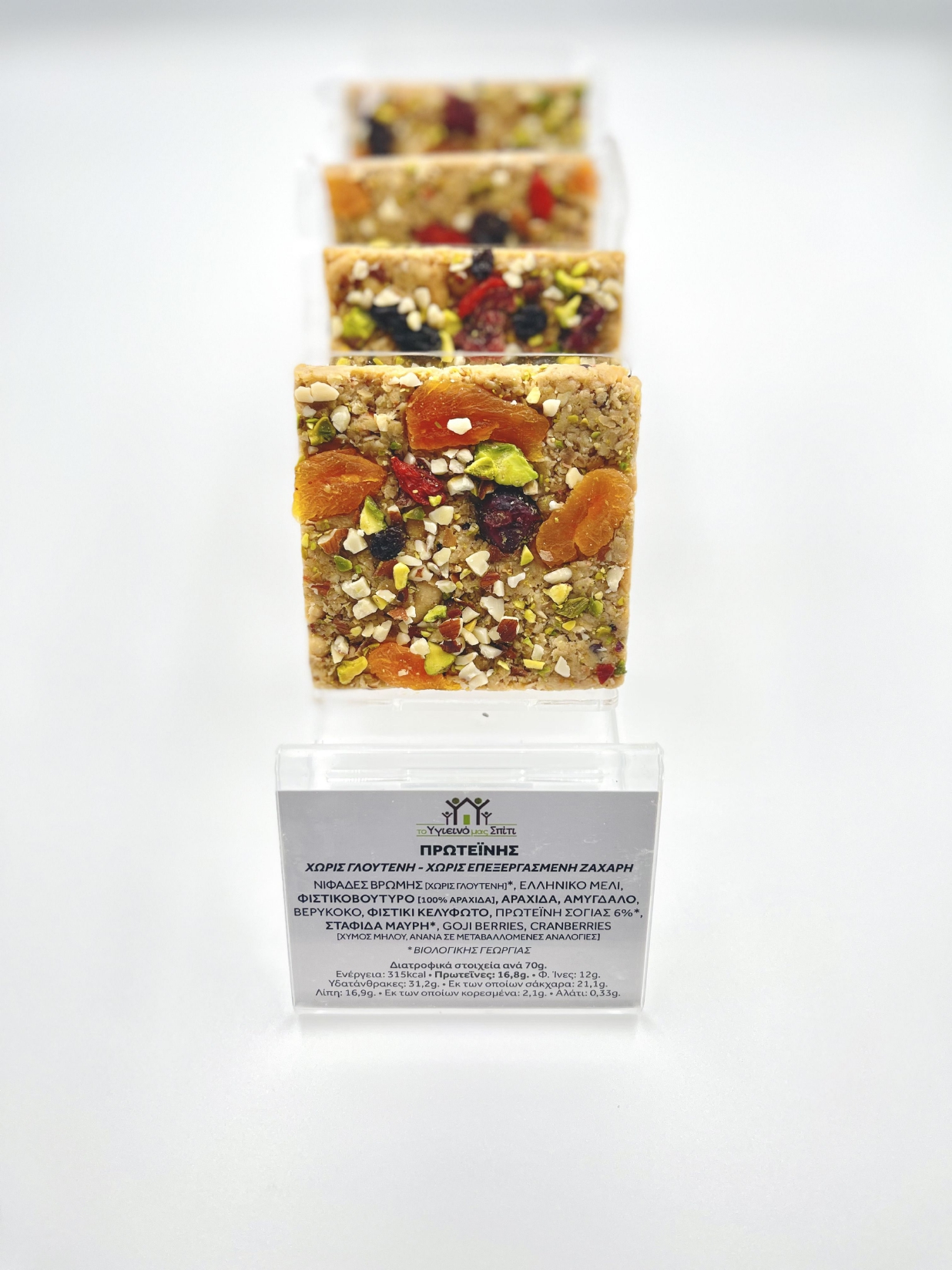Συστατικά: Ελληνικό μέλι, βιολογική βρώμη, βιολογική σταφίδα μαύρη, αμύγδαλο, βερύκοκο, φυστίκι κελυφωτό, πρωτείνη σόγιας, goji berry, cranberries (χωρίς προσθήκη ζάχαρης).