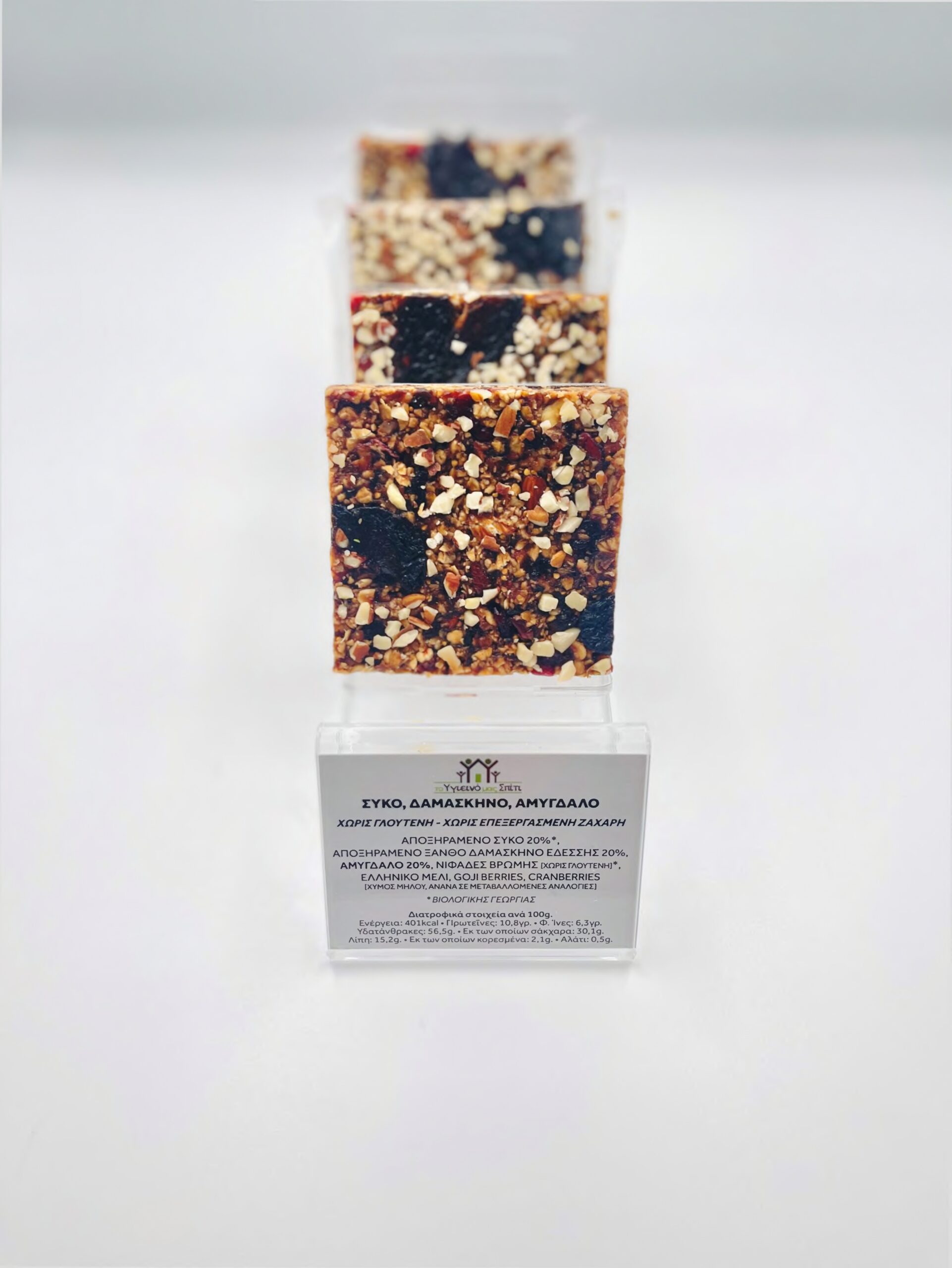 Συστατικά: Σύκο, Δαμάσκηνο, Γκότζι Μπέρι. Ιπποφαές, Αμύγδαλο, Νιφάδες Φαγόπυρου, Κράνμπερι, Ελληνικό Μέλι.